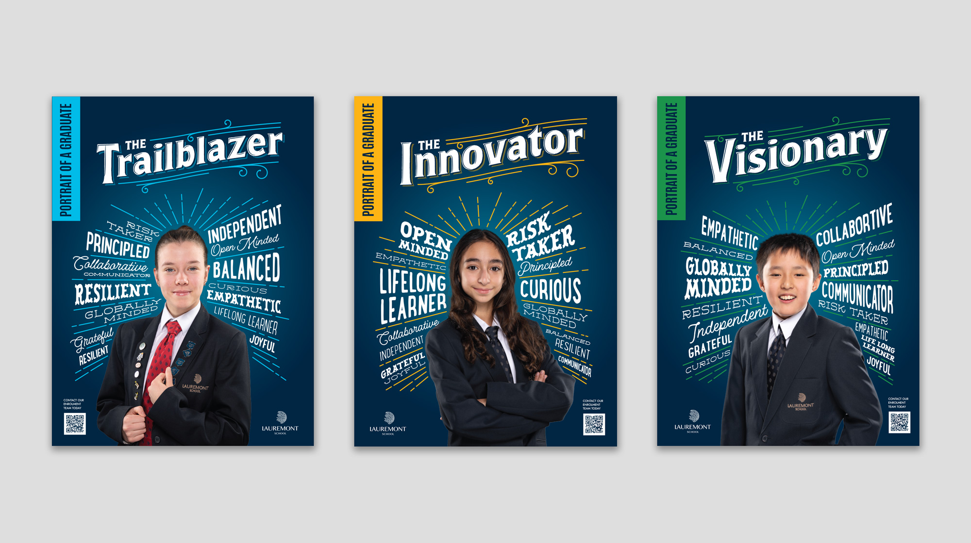 For Lauremont’s 2026 Admissions ad campaign, the goal was to present a portrait of a Lauremont graduate as they become future-ready. This print and digital campaign used custom typography to highlight the core values of a graduate.